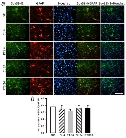 The changes of Suv39H1 levels in the astrocytes of ischemic penumbra at 4 and 24 h after photothrombotic stroke (PTS) in the rat cerebral cortex. The level of Suv39H1 is shown at 4 and 24 h after PTS (PTS4 and PTS24, respectively) compared to the contralateral cortex of the same animals (CL4 and CL24), or the cortex of sham-operated rats (SO). (a) Immunofluorescence of Suv39H1 (green), marker of astrocytes GFAP (red), nuclear chromatin marker Hoechst 33342 (blue), and image overlay. The scale bar is 50 μm. (b) Coefficient M1 of Suv39H1 co-localization with astrocyte marker (GFAP) in different control and experimental groups. One Way ANOVA; M ± SEM; n = 7.