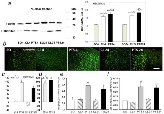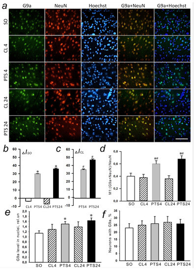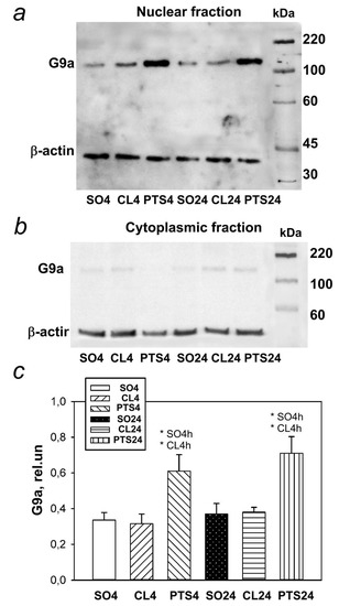 In addition, analysis of G9a fluorescence in the nucleus of cells showed an increase by 32% and 44% in its level in the nucleus at 4 and 24 h after PTS (Figure 8e), respectively, although the number of cells expressing the protein did not increase (Figure 8f).