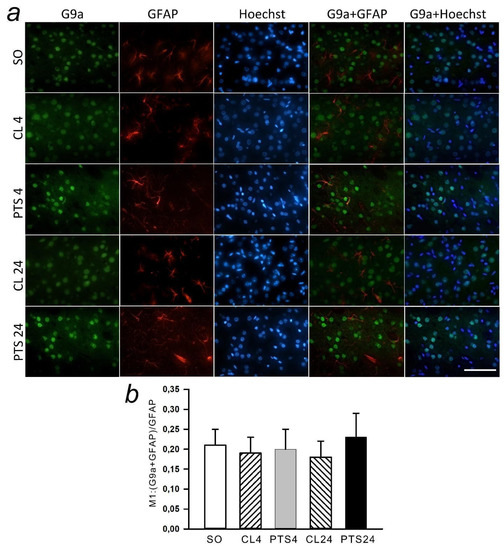 The changes of G9a levels in the astrocytes of ischemic penumbra 4 and 24 h after photothrombotic stroke (PTS) in the rat cerebral cortex. G9a levels (PTS4 and PTS24, respectively) compared to contralateral cortex of the same animals (CL4 and CL24), or the cortex of sham-operated rats (SO) are shown. (a) Immunofluorescence of G9a (green), marker of astrocytes GFAP (red), nuclear chromatin marker Hoechst 33342 (blue), and image overlay. The scale bar is 50 μm. (b) Coefficient M1 of G9a co-localization with astrocyte marker (GFAP) in different control and experimental groups. One Way ANOVA; M ± SEM; n = 7.