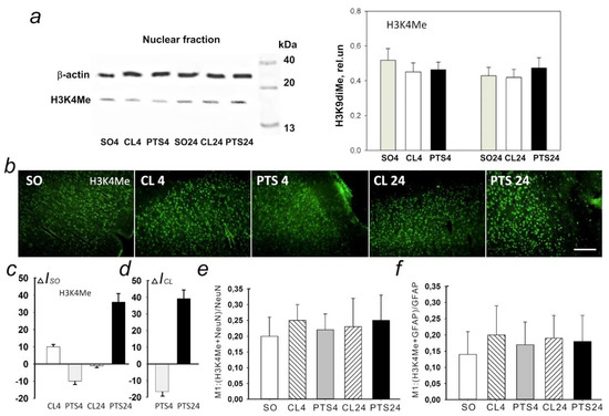Western blotting (Figure 11a) and immunofluorescence microscopy (Figure 11b) did not reveal significant changes in H3K4Me expression in the penumbra at 4PTS4 and PTS24 as compared with the contralateral cortex of the same rats and with the cerebral cortex of SO animals.
