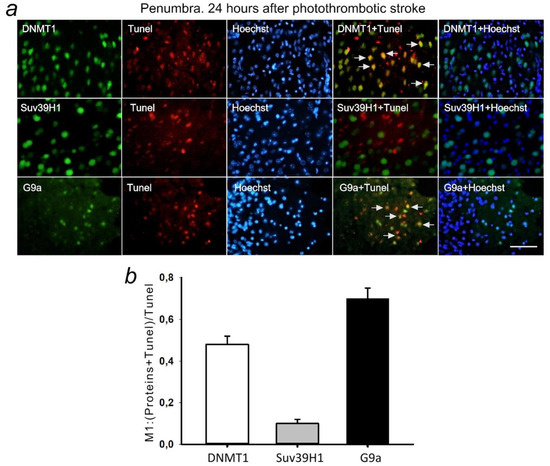 (a) Immunofluorescence of DNMT1, Suv39H1, G9a, and TUNEL-positive apoptotic cells, nuclear chromatin marker Hoechst 33342, and image overlay in the penumbra 24 h after photothrombotic stroke in the rat cerebral cortex. The scale bar is 100 μm. Cells containing DNMT1 or G9a co-localized with the TUNEL-positive apoptotic cells (shown by white arrows). (b) Coefficient M1 of DNMT1, Suv39H1, or G9a co-localization with TUNEL in penumbra at 24 h after photothrombotic stroke. M ± SEM; n = 7.