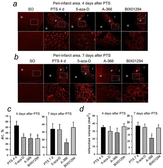 The study investigated the putative neuroprotective effect of the following inhibitors of epigenetic proteins were used: DNMT1 (5-azacytidine or decitabine (0.2 mg/kg, 1 per day, 7 days) [31,32,33], histone methyltransferases SUV39H1 and G9a (BIX01294 (0.5 mg/kg, once a day, 7 days) [34], and A-366 (2 mg/kg, once a day, 7 days) [35]. They were dissolved in dimethyl sulfoxide (DMSO) and then diluted in sterile saline. The final concentration of DMSO was 5%. All inhibitors were administered 1 h after PTS. Mice were decapitated 4 and 7 days after PTS and 1 h after the last injection of drugs to study the level of apoptosis in the peri-infarction area and the volume of infarction.