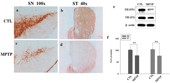 MPTP and saline were injected intraperitoneally once daily in the control (CTL) and MPTP groups, respectively. After four weeks, to confirm that a chronic MPTP-induced PD mouse model was established, we analyzed the changes in tyrosine hydroxylase (TH) expression in the SN and striatum (ST). The expression of TH was significantly decreased in MPTP mice (Figure 1c,d) compared to that in the CTL mice in both the SN and ST. Similar to the results of the Western blot analysis, it was confirmed that the expression of TH was significantly reduced in the SN and ST (p < 0.005) treated with MPTP (Figure 1).