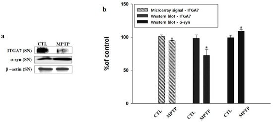 Microarray signal analysis of the SN confirmed that the ITGA7 signal in MPTP-treated mice was decreased compared to that in CTL (p < 0.05, n = 2, Figure 2b). Therefore, when ITGA7 expression was evaluated by Western blot analysis, it was confirmed that the expression of ITGA7 was significantly decreased in the MPTP group compared to that in the CTL group (p < 0.05, n = 3, Figure 2a,b). α-syn expression was evaluated using Western blot analysis, and it was confirmed that the expression of α-syn was significantly increased in the MPTP group compared to that in the CTL group (p < 0.05, n = 3, Figure 2a,b).