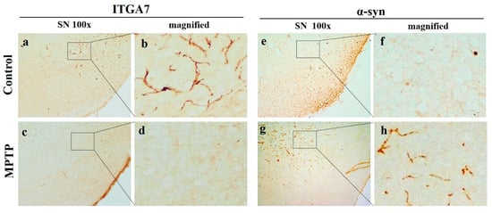 Immunohistochemical analysis (IHC) showed that the expression of ITGA7 in the SN was significantly decreased in the MPTP group (Figure 3c,d) when compared to that in the CTL group (Figure 3a,b). Conversely, the expression of α-syn was remarkably increased in the MPTP group (Figure 3e–h). Although the expression of ITGA7 and α-syn was inversely proportional, the patterns were similar.
