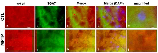 Immunofluorescence analysis of ITGA7 and α-syn revealed co-localization and showed that ITGA7 expression was stronger in the CTL group (Figure 4a) than in the MPTP group (Figure 4f). Conversely, α-syn was more strongly expressed in the MPTP group than in the CTL group (Figure 4b,g). When ITGA7 and α-syn were merged (Figure 4c,d,h,i), the expression of ITGA7 was stronger in the CTL group (Figure 4d), whereas the expression of α-syn was stronger in the MPTP group (Figure 4i).