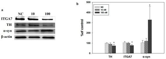 (a) Western immunoblot analysis showed that the administration of ITGA7 siRNA decreased ITGA7 and TH expression but increased α-synuclein (α-syn) expression in the SH-SY5Y cells. (b) NC, negative control siRNA treatment (100 nM for 24 h); 10, ITGA7 siRNA treatment (10 nM for 24 h); 100, ITGA7 siRNA treatment (100 nM for 24 h). * denotes p < 0.05 compared to NC. All values are expressed as mean ± standard error, and statistical analysis was performed using ANOVA.