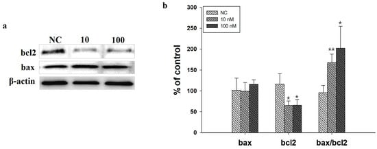 (a) Western immunoblot analysis revealed that the administration of ITGA7 siRNA significantly decreased bcl2 expression and increased the bax/bcl2 ratio in SH-SY5Y cells. (b) NC, negative control siRNA treatment (100 nM for 24 h); 10, ITGA7 siRNA treatment (10 nM for 24 h); 100, ITGA7 siRNA treatment (100 nM for 24 h). * denotes p < 0.05 and ** p < 0.001 compared to NC. All values are expressed as mean ± standard error, and statistical analysis was performed using ANOVA.