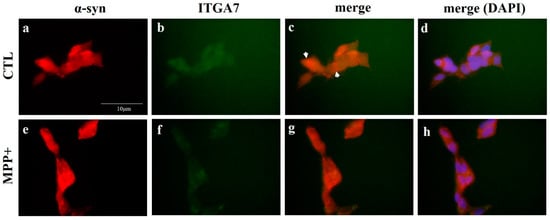 Immunofluorescence analysis of ITGA7 and α-syn revealed their co-localization, and the expression of ITGA7 was stronger in the CTL than in MPP+-treated SH-SY5Y cells (Figure 7b,f). Conversely, the expression of α-syn was stronger in the MPP+-treated group than in the CTL group (Figure 7a,e). When α-syn and ITGA7 were combined, ITGA7 expression was strong in the CTL group and α-syn was strongly expressed in the MPP+-treated group (Figure 7c,g).