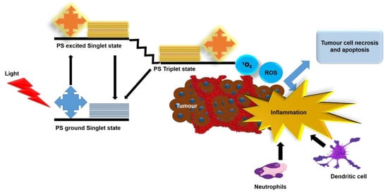 Photodynamic therapy (PDT) is a cancer modality that combines three essential components of a photosensitizer (PS), harmless light, and molecular oxygen []. It is based on the accumulation of a PS in pathological tissues, which can generate highly cytotoxic reactive oxygen species (ROS) upon its activation with a specific wavelength of light []. PDT presents unique advantages such as the selective uptake of PSs by tumor tissues, localized light exposure to the affected site, non-invasiveness feature, and simple procedure. Additionally, it endows low toxicity and high efficacy, with no drug resistance [,]. As shown in Figure 1, ROS generated by PDT can directly destruct the vasculature of the tumor by induction of apoptosis and/or necrosis, resulting in oxygen and nutrient depletion in the tumor []. As a result of this photodamage to the tumor and its microenvironment, a robust acute inflammatory response is produced at the tumor site [,]. The acute inflammatory response following PDT stimulates the immune system and causes the infiltration of host innate immune cells, which clear damaged cells in the treated area [,]. In a later stage, an adaptive immune memory may occur, allowing for a systemic response that can inhibit tumor recurrence and metastases in the long run [].