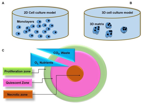 In recent years, 3D tumor cultures have emerged as excellent cancer models, which can bridge between preclinical and clinical studies for better evaluation of novel anticancer drugs []. Spheroids as a type of 3D tumor cultures closely resemble solid tumors in vivo as they exhibit different aspects of a solid tumor cellular heterogeneity, oxygen and nutrients, cell–cell signaling, cell–cell contacts, growth kinetics, and resistance to anticancer agents (Figure 2B) [,]. The spheroid structure shows an internal layered cell distribution similar to solid tumors (Figure 2C) []. Within this structure, various forms of cells, such as proliferating, quiescent, apoptotic, hypoxic, and necrotic cells are established [,]. Accordingly, due to access to oxygen and nutrients from the culture media, proliferating cells are located in the outer layer of the spheroids and resemble cancer cells close to the capillaries in vivo [,]. Conversely, the middle layer is characterized by quiescent cells because cell metabolism decreases progressively as the distance from the spheroid periphery increases []. Cells at the core of spheroids typically undergo necrosis due to the deprivation of oxygen, growth factors, and nutrients, as well as the accumulation of waste products []. Therefore, it is logical to theorize that the cellular processes of these cultures are relevant at this juncture, due to the morphological features, cellular interactions, and heterogeneity of 3D cell cultures [].