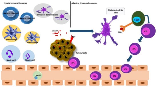 The innate arm of the immune response system eliminates pathogenic agents by phagocytes (macrophages, neutrophils, and dendritic cells (DCs), the complement cascade, and natural killer (NK) cells []. Following an acute inflammatory response, PDT-induced activation of the innate immune system involves the release of cytokines, complement activation, infiltration, and activation of innate immune cells [,]. Then, post-treatment, the oxidative stress triggered by PDT leads to extended tumor tissue destruction []. Damaged tumor cells would exhibit damage-associated molecular patterns (DAMPs) or secrete DAMPs into the extracellular matrix [,,]. Those DAMPs serve as harmful signals and can be recognized by antigen-presenting cells (mainly the DCs) []. DCs ingest and process tumor-associated antigens (TAAs) and present TAA-derived peptides to effector T cells, thereby coordinating an antitumor adaptive immunity, which could confer a prolonged systemic tumor immune control [,,].