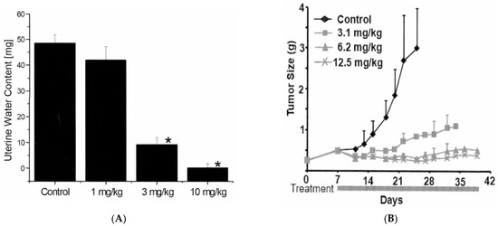 The effect of ABT-123 on vascular permeability was evaluated in an estradiol-induced rat uterine edema model [35]. Twelve-week-old balb/c female mice (Taconic, Germantown, NY, USA) were pretreated with 10 units of pregnant mare’s serum gonadotropin intraperitoneally (i.p.) 72 and 24 h prior to estradiol. ABT-123 at the indicated dose or vehicle control were then administered 30 min prior to a bolus i.p. injection of 25 µg estradiol. The uteri were harvested 2.5 h later. The uteri were weighed, blotted to remove water, and reweighed. The difference between wet and blotted weights represented the water content of the uterus.