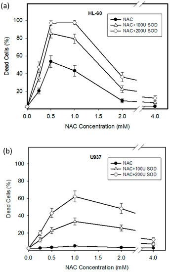 Effect of NAC on cell viability in HL-60 and U937 cells. Cells were treated with NAC or with NAC + SOD, as indicated. After 24 h incubation, the number of dead cells was determined using the trypan blue dye exclusion assay. (a) HL-60 cells. (b) U937 cells. The points represent the mean from three independent experiments with standard errors.
