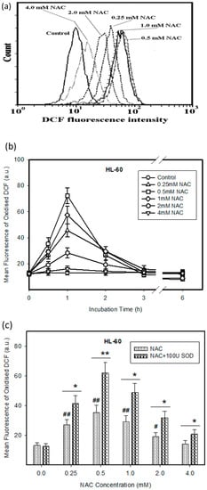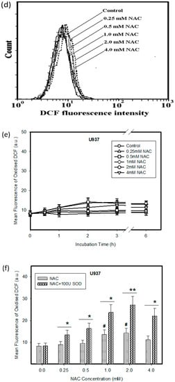 Effect of NAC on ROS production in HL-60 and U937 cells. Cells were treated with NAC as indicated. After the indicated period, the incubation cells were stained with H2DCF-DA and fluorescence intensity was analyzed using flow cytometry. (a) Effect of NAC on ROS production in HL-60 cells (a typical analysis). (b) Time course of ROS production in NAC treated HL-60 cells. (c) Effect of SOD on ROS production in NAC treated HL-60 cells. Points represent mean value from three independent experiments with standard errors. (d) Effect of NAC on ROS production in U937 cells (a typical analysis). (e) Time course of ROS production in NAC treated U937 cells. (f) Effect of SOD on ROS production in NAC treated U937 cells. Points represent mean value from three independent experiments with standard errors. #/## denotes significant/very significant difference in the mean fluorescence of oxidized DCF (p < 0.05/p < 0.01) between the NAC treated and untreated (control) cells. */** denotes significant/very significant difference in the mean fluorescence of oxidized DCF (p < 0.05/p < 0.01) between the indicated treatments.