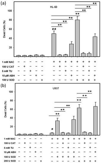 Effect of ROS modulators on viability of NAC treated HL-60 and U937 cells. Cells were treated with NAC or with NAC in combinations with ROS modulators as indicated. After 24 h incubation, the number of dead cells was determined using the trypan blue dye exclusion assay. (a) HL-60 cells. (b) U937 cells. Columns represent the mean from three independent experiments with standard errors. #/## denotes significant/very significant difference in the number of dead cells (p < 0.05/p < 0.01) between the NAC treated and untreated (control) cells. ** denotes very significant difference in the number of dead cells (p < 0.01) between the indicated treatments.