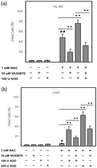 Effect of VAS2870 on viability of NAC treated HL-60 and U937 cells. Cells were treated with NAC in combinations with VAS2870 or with NAC in combinations with SOD and VAS2870 as indicated. After 24 h incubation, the number of dead cells was determined using the trypan blue dye exclusion assay. (a) HL-60 cells. (b) U937 cells. Columns represent the mean from three independent experiments with standard errors. #/## denotes significant/very significant difference in the number of dead cells (p < 0.05/p < 0.01) between the NAC treated and untreated (control) cells. ** denotes very significant difference in the number of dead cells (p < 0.01) between the indicated treatments.