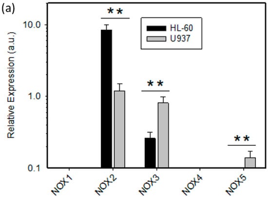 Detailed analysis revealed that the main source of O2•− production is probably NOX2 in HL-60 cells (Figure 5a and Figure 6a). Other NOXs do not appear to play any significant role in superoxide production because they are either not expressed (NOX1, NOX4, NOX5) or their expression is very low compared to NOX2 (NOX3) (Figure 5a). Our data are thus in good agreement with the findings of other authors on the expression, function, and localization of NOX2 [22,23].