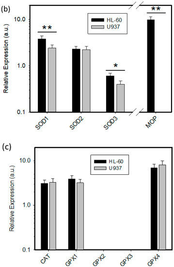 Analysis of the mRNA expression of ROS-related genes in HL-60 and U937 cells. (a) Expression analysis of NOX1–NOX5 genes. (b) Expression analysis of SOD1–SOD3, and MPO genes. (c) Expression analysis of CAT and GPX1–GPX4 genes. Results represent the mean values of four independent experiments with standard errors. */** denotes significant/very significant difference in the relative expression of appropriate ROS-related gene (p < 0.05/p < 0.01) between HL-60 and U937 cells.