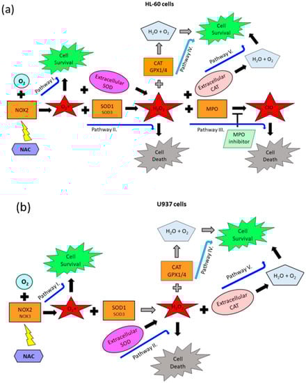 Based on the analysis of the expression of ROS modulating genes and the results above, we proposed a hypothetical scheme with identification of biochemical pathways responsible for the origin, transformation and/or degradation of individual ROS and their possible contribution to cell death or cell survival in both cell lines. (Figure 6). These observations collectively suggested that the primary ROS induced by NAC was superoxide radical O2•− that was produced by NOX(s) close to the cell membrane or extracellularly since VAS2870 and extracellular SOD and CAT can significantly modulate the viability in both cell lines (Figure 1, Figure 2, Figure 3, Figure 4, Figure 5 and Figure 6). The probable producer of superoxide is NOX2 in HL-60 cells and NOX2/3 in U937 cells (Figure 5 and Figure 6). Interestingly, even massive production of O2•− by NOX2/3 was not sufficient to induce cell death in either cell line (Figure 6—Pathway I) H2O2, a product of SOD1/3, together with ClO−, a product of MPO, were probably the most important cell death related ROS in HL-60 cells (Figure 3a, Figure 5, and Figure 6a—Pathway II and Pathway III). Inherent expression of CAT and GPX1/4 failed to prevent cell death in HL-60 cells (Figure 5 and Figure 6a—Pathway IV). In contrast, H2O2 was probably the most important cell death related ROS in U937 cells (Figure 3b, Figure 5, and Figure 6b—Pathway II). However, cytotoxic levels of H2O2 can be achieved only by extracellular SOD but not by SOD1/3. This is due either to the low activity of SOD1/3 or due to the protective effect of CAT plus GPX1/4 (Figure 5 and Figure 6b—Pathway IV).