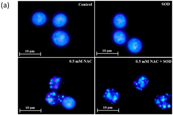 Our results further suggest that NAC induced cell death with morphological and biochemical apoptotic hallmarks in HL-60 cells (Figure 7). We assume that the intrinsic pathway is activated as judged from elevated activity of caspase-9 (Figure 7d). The enhanced cytotoxic effect of NAC by the addition of extracellular SOD increases the number of dead cells without changing the type of cell death in HL-60 cells (Figure 7). The situation is slightly different for U937 cells (Figure 8). Here, too, the addition of extracellular SOD causes cell death with predominantly apoptotic features (Figure 8). However, some dead cells do not have typical morphological apoptotic features. Instead of apoptotic bodies, we can observe small condense nuclei (Figure 8a,b). We have previously described this morphologically somewhat unusual type of cell death in human leukemia cells [16,19,20]. Such nuclear morphology was found in experimental systems where the cells underwent an apoptotic program, and, at the same time, caspase activity was inhibited either by a pan-specific caspase inhibitor [19,20] or by cadmium [16]. Importantly, caspase-9 and caspase-3/7 activity is evidently lower in dying U937 than HL-60 cells (compare Figure 1a,b, Figure 7d and Figure 8d). Based on published results, it can be assumed that the H2O2 formed above a certain concentration may completely inhibit caspase activity [28].