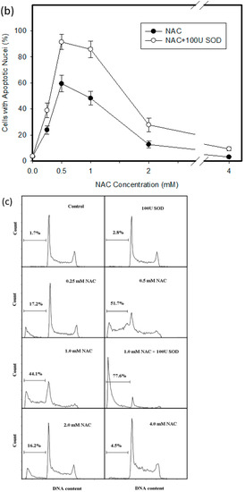 However, the biological effects of NAC are more complex. Several research groups have reported that NAC can even enhance cell death induced by other cytotoxic compounds under certain conditions. For example, NAC enhanced imatinib induced cell death via stimulation of NO production in human leukemia K562 [13] and it enhances fisetin induced apoptosis via ROS independent mechanism [14]. In addition, Zheng et al. reported that NAC interacts with Cu2+ to generate hydrogen peroxide, which induce cell death in cancer cells [15]. Importantly, we recently observed that low concentrations of NAC (0.5–1 mM) could enhance the cytotoxic effect of Cd2+ solely via the massive ROS production [16].