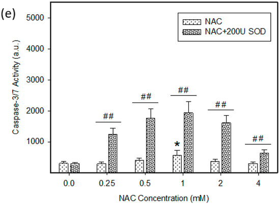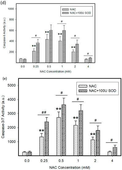 Effect of NAC on cell death features in U937 cells. Cells were treated with NAC or with NAC in combination in SOD as indicated. After 24 h incubation, cell death features were analyzed. (a) Effect on nuclear morphology. Pictures represent typical examples. (b) Effect on nuclear morphology—a quantitative analysis. Points represent mean from three independent experiments with standard errors. (c) Effect on DNA fragmentation (hypodiploid DNA content). Histograms represent typical examples. (d) Effect on caspase-9 activation. Points represent mean from three independent experiments with standard errors. (e) Effect on caspase-3/7 activation. Points represent mean from three independent experiments with standard errors. * denotes significant difference in the caspase activity (p < 0.05) between the NAC treated and untreated (control) cells. #/## denotes significant/very significant difference in the caspase activity (p < 0.05/p < 0.01) between the indicated treatments.