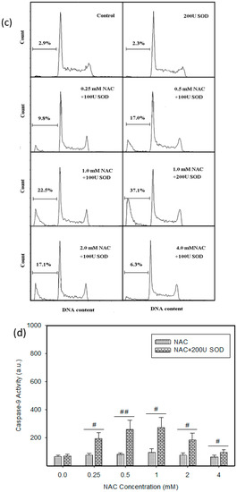 Next, we studied the mode of cell death elicited by NAC. We observed that dying HL-60 cells exhibited morphological and biochemical features of apoptosis, including chromatin condensation (Figure 7a,b), DNA fragmentation (Figure 7c), caspase-9 (Figure 7e), and caspase-3/7 activation (Figure 7f). Importantly, addition of SOD increased the number of dead cells with typical apoptotic hallmarks (Figure 7). In U937 cells treated with NAC in combination with SOD was an increase in the number of dead cells with predominantly morphological and biochemical features of apoptosis (Figure 8). Importantly, in some dead cells we observed small condensed nuclei (Figure 8a,b), a morphology which is typical for cells undergoing apoptotic program suppressed by pan-specific caspase inhibitor Z-VAD-FMK [19,20]. No cells with swollen nuclei typical for necrosis were found (not shown).