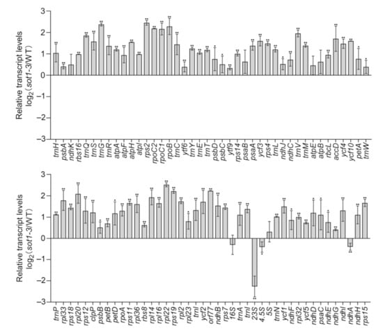 Steady-state levels of chloroplast gene transcripts in the wild type (WT) and sot1-3. The transcript levels of the chloroplast genes were determined using quantitative PCR (qPCR) in 12-day-old seedlings. The values are given as log2 fold changes of gene expression in the sot1-3 mutant relative to that of the WT. Mean values ± SD of three independent experiments are shown. Student’s t-test was carried out to determine the significance of the difference of transcript levels between WT and sot1-3 plants. * indicates a significant difference at p < 0.05, whereas ** indicates a significant difference at p < 0.01.