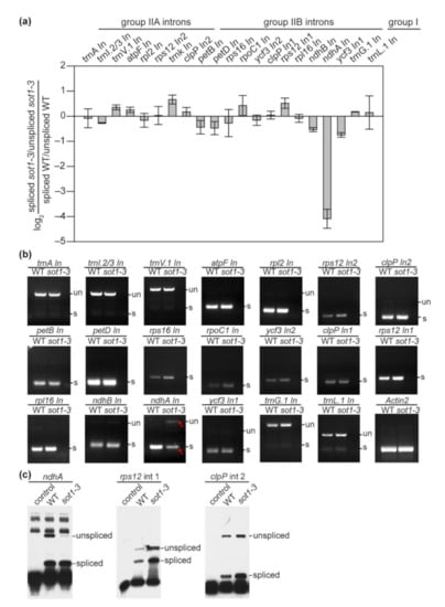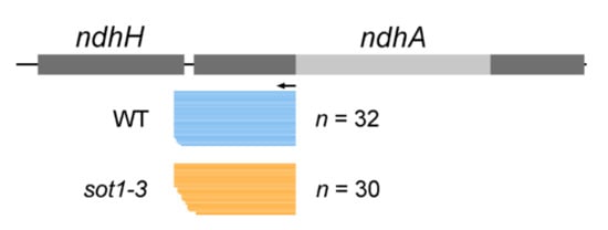 Strand-specific RNA sequencing was performed according to Hotto et al. (2015) []. Two independently replicated experiments were performed. Total RNA was isolated from 12-day-old WT and sot1-3 seedlings. After being treated with DNase (Promega, Madison, WI, USA), a RiboMinus plant kit (ThermoFisher, Waltham, MA, USA) to the RNA to remove rRNA. The RNA-seq library was prepared from the rRNA-depleted DNA-free RNA by OE Biotech. The samples were run on a single lane using an Illumina HiSeq 2500 with 150-bp pair-end reads. After quality control, strand-specific reads with a quality higher than 30 and a length longer than 60 were aligned to the Arabidopsis chloroplast genome (TAIR10) using TopHat2. The relative transcript abundance and splicing efficiency of the chloroplast genes were calculated using the ChloroSeq pipeline [].