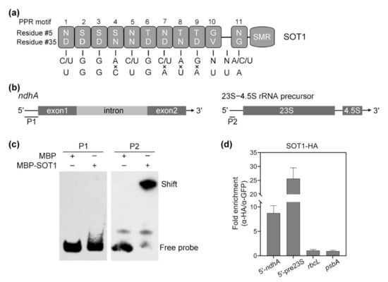 Consistent with their function in the regulation of organellar RNA metabolism, a large number of PPR proteins have been shown to bind RNA directly [,,]. Given the results above indicate that SOT1 is involved in the stabilization and splicing of ndhA transcripts, the potential targets of SOT1 were examined. Initially, we predicted the binding sequence pattern of SOT1 using the RNA selection “codes” determined by the 5th and 35th residues in each PPR motif, as described previously [,,,]. SOT1 contains 11 PPR motifs, but the predicted 10th and 11th motifs are separated by a 32 amino acid gap (Figure 4a). This additional ‘motif’ creates a gap that may occupy one base length, and should be taken into account when searching the RNA target for SOT1. Thus, we used the (C/U)GGA(C/U)G(C/U)AGNN(A/C/U) sequence pattern to predict the binding site of SOT1 across the ndhA genome sequence, especially the regions close to the transcripts’ termini. We obtained a hit (UGGCUGAUAUUA) containing four mismatches compared to the inquiry sequence adjacent to the 5′ end of the ndhA transcripts (Figure 4a). These results suggest that UGGCUGAUAUUA at the 5′ end of ndhA transcripts is a potential binding sequence of SOT1.