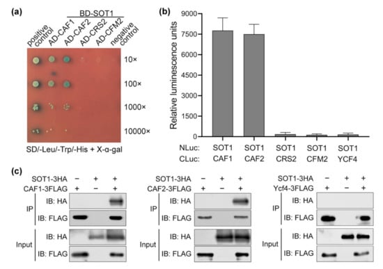 To identify proteins moderating the SOT1-mediated stability of ndhA transcripts, we used SOT1 as a bait in a yeast two-hybrid screen and identified two putative interaction partners, CAF1 and CAF2. These proteins, each with two CRM domains, were reported to play essential roles in splicing group II introns in chloroplasts [,]. CAF1 and CAF2 bind to CRS2 to form CRS2–CAF1 and CRS2–CAF2 complexes, which regulate the splicing of a set of group II introns in plastid RNAs []. Moreover, CRM FAMILY MEMBER 2 (CFM2) resides in large ribonucleoprotein complexes that include CAF1 and/or CAF2 and was shown to promote the splicing of the ndhA intron []. Thus, we further examined whether SOT1 interacts with these four proteins.