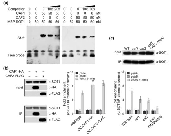 2.4. The CAF Proteins Activate SOT1 to Stabilize ndhA Transcripts by Promoting SOT1 Binding and Inhibiting its RNA Endonuclease Activity