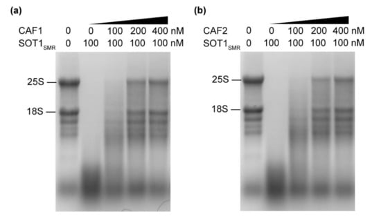 The RNA nuclease activity of the SMR domain of SOT1 can be inhibited by CAF proteins. The recombinant SOT1SMR protein, together with increasing concentrations of CAF1 (a) or CAF2 (b) proteins, was incubated with total wild-type Arabidopsis RNA at 25 °C for 30 min. The reaction products were separated on agarose/formaldehyde gels and observed using ethidium bromide staining. Three independent experiments were performed, and one representative experiment is shown.