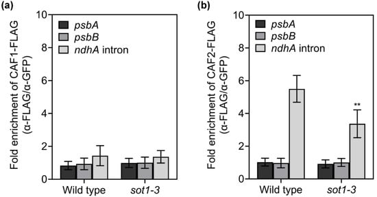 The loss of SOT1 results in the decreased association of CAF2 with the ndhA intron. The C-terminal FLAG fusion of CAF1 or CAF2 was expressed in protoplasts isolated from 12-day-old WT and sot1-3 seedlings. Chloroplasts were harvested from the transfected protoplasts. The relative transcript levels of the psbA, psbB, and ndhA introns in α-FLAG immunoprecipitated complexes were determined via qPCR. Student’s t-test was carried out to determine the significance of the fold enrichments of CAF2 on ndhA intron between WT and sot1-3 plants. ** indicates a significant difference at p < 0.01. Mean values ± SD of the triplicate replicates are shown.
