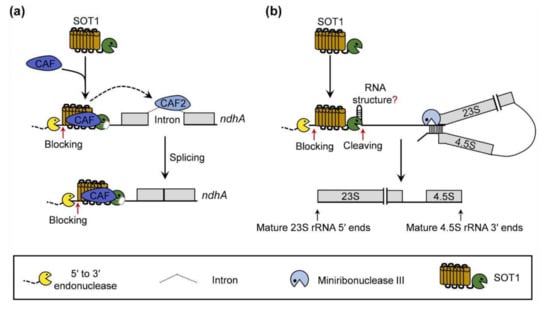 In summary, based on the knowledge gained in this study as well as the previous reports on the roles of SOT1 in rRNA maturation [,,], we propose a working model for SOT1 in the chloroplast RNA metabolism. SOT1 interacts with CAF proteins (CAF1 or CAF2) to form an interaction complex that confers high binding affinity to the 5′ ends of ndhA transcripts. The CAF proteins also inhibit the RNA endonuclease activity of the SMR domain in SOT1. Thus, the CAF proteins make SOT1 behave similarly to other PPR proteins lacking the SMR domain, stabilizing ndhA transcripts to protect them from 5′ → 3′ exonucleolytic degradation. In addition, the SOT1-mediated stability of ndhA may help promote the splicing of ndhA precursors by facilitating the association of CAF2 with the ndhA intron (Figure 10a). Without interacting with CAF proteins, SOT1 also directly binds the 5′ ends of 23S−4.5S rRNA precursor via its PPR motifs and cleaves it at the −38 nt site relative to the 5′ ends of mature 23S rRNA via its C-terminal SMR domain, facilitating the proper 5′ maturation of 23S rRNA and 3′ maturation of 4.5S rRNA by miniribonuclease III (Figure 10b).