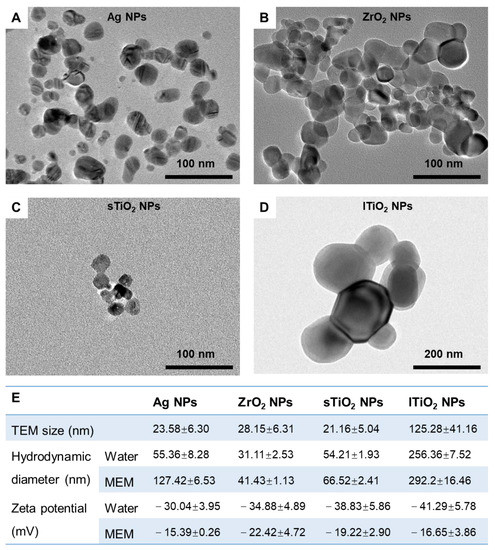 Characterization of MNPs. (A–D) TEM graphs of Ag NPs (A), ZrO2 NPs (B), small-sized TiO2 (sTiO2) NPs (C), and large-sized TiO2 (lTiO2) NPs (D). (E) Summarized characteristics of these four MNPs, including TEM size, hydrodynamic diameter, and zeta potential in DI water and MEM cell culture medium supplemented with 10% fetal bovine serum (FBS). In (E), data are shown as means ± s.d., n = 3.