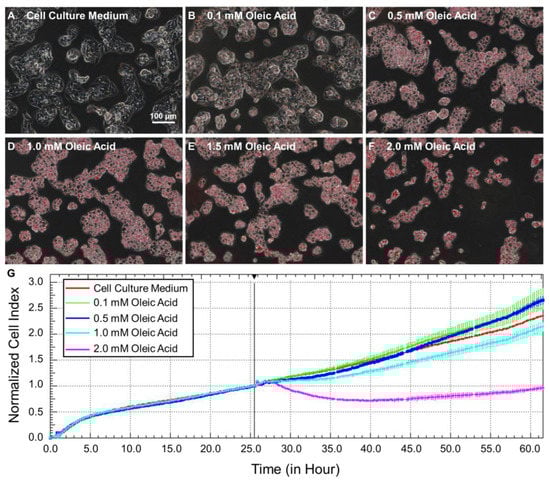 Steatotic hepatocyte modeling. (A–F) Micrograph of HepG2 cells with oil red O staining after 24 h treatments with OA of various concentrations. (G) Real-time growth status of HepG2 cells, as reflected by normalized cell index, in response to OA exposures.