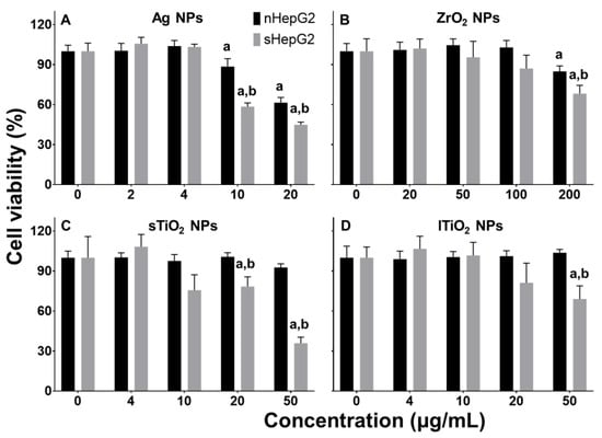 Susceptibility of steatotic hepatocytes to cytotoxicity in response to MNP exposures. (A–D) Dose-dependent viability of non-steatotic and steatotic HepG2 cells treated with Ag NPs (A), ZrO2 NPs (B), and TiO2 of different sizes (C,D). Data are shown as means ± s.d., n = 5. a p < 0.05, compared with vehicle control. b p < 0.05, compared with viability of nHepG2 cells with the same treatment.
