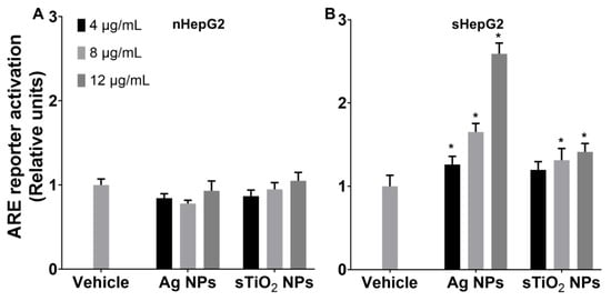 Using an antioxidant responsive element (ARE) reporter HepG2 cell line (as described in the Materials and Methods), we further investigated the ARE gene expression in nHepG2 and sHepG2 with NP treatments. Ag NPs and sTiO2 NPs showed little alteration on the expression of ARE reporter in nHepG2 cells, with the relative units ranging from ~0.8 to ~1.0 (Figure 4A). The ARE reporter expressions in sHepG2 cells exposed to 4, 8, or 12 μg/mL Ag NPs were 1.3-, 1.7-, and 2.6-fold that of vehicle treatment (Figure 4B). Such upregulated expressions of ARE reporter were much lower in sTiO2 NP treated sHepG2 cells, with the relative units ranging from 1.2 to 1.4 (Figure 4B).