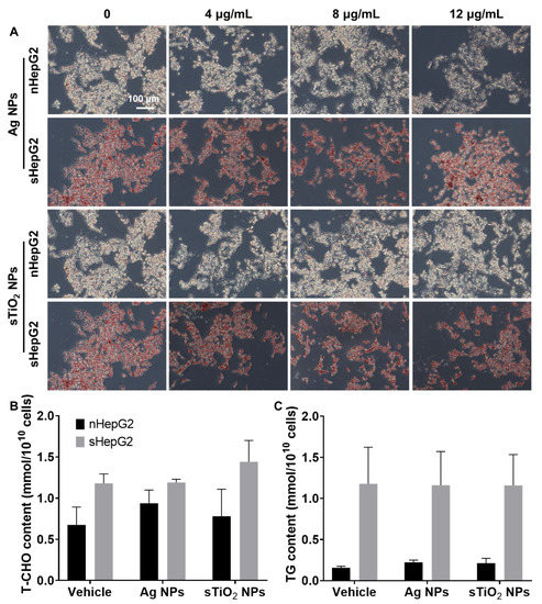 Qualitative and quantitative characterization of intracellular lipids in nHepG2 and sHepG2 cells after various treatments. (A) Micrograph of nHepG2 and sHepG2 cells with oil red O staining after 24 h treatments with Ag NPs or sTiO2 NPs. (B,C) Intracellular total cholesterol (T-CHO, (B)) and triacylglycerol (TG, (C)) contents in nHepG2 and sHepG2 cells treated with 4 μg/mL Ag NPs or sTiO2 NPs. In (B,C), data are shown as means ± s.d., n = 3.