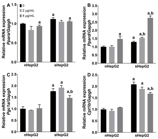 Expressions of FAO-related genes in nHepG2 and sHepG2 cells in response to Ag NP exposure. (A–D) Relative expressions of Ppara (A), Ppard (B), Pgc1a (C), and Cpt1b (D) in nHepG2 and sHepG2 cells exposed to 0, 2, and 4 μg/mL Ag NPs for 24 h. Data are shown as means ± s.d., n = 3. a p < 0.05, compared with vehicle control of nHepG2 cells. b p < 0.05, compared with vehicle control of sHepG2 cells.