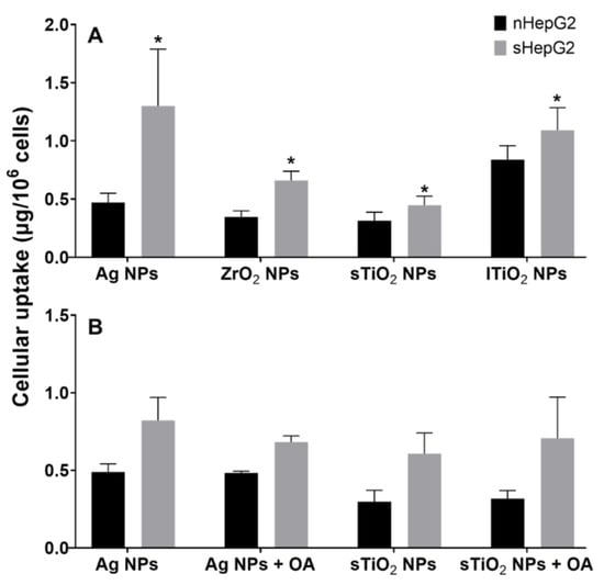 The intracellular amounts of MNPs increased with the exposure doses, resulting in dose-dependent cytotoxicity of various MNPs, which has been well-recognized in previous studies [50,51,52]. Thus, the MNP-induced cytotoxicity is primarily determined by the intracellular dose of MNPs. In this work, we found that both Ag NPs and sTiO2 NPs had much higher accumulation in sHepG2 cells than in nHepG2 cells (Figure 7a), which was suggested to be responsible for the susceptibility of sHepG2 cells in response to MNP exposure. Even though we excluded the contribution of OA on the differential internalization of MNPs in nHepG2 and sHepG2 cells (Figure 7b), the underlying mechanisms of the enhanced accumulation of MNPs in steatotic hepatocytes remain to be elucidated from how the steatotic status affects the internalization, subcellular localization, and excretion of MNPs in steatotic hepatocytes.
