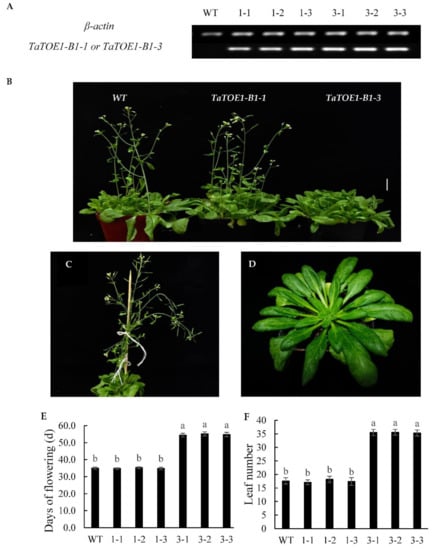 Chicago/Turabian StyleSong, Tianqi, Yang Yu, Mingfei Zhang, Hongwei Zhou, Shuangxing Zhang, Ming Yu, Jianfei Zhou, Jie Cheng, Jishan Xiang, Songjie Yang, and et al. 2021. "A Wheat TaTOE1-B1 Transcript TaTOE1-B1-3 Can Delay the Flowering Time of Transgenic Arabidopsis" International Journal of Molecular Sciences 22, no. 23: 12645. https://doi.org/10.3390/ijms222312645