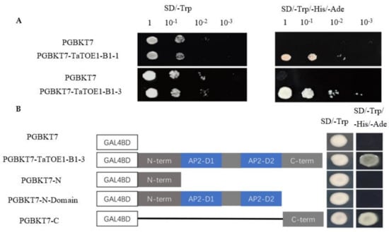 2.5. TaTOE1-B1-1 and TaTOE1-B1-3 Are Localized in the Nucleus and Have Transcriptional Activation Activity