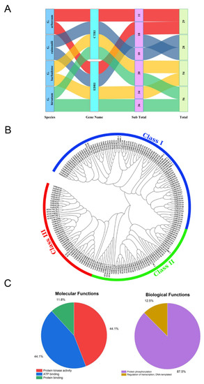 MAPK (mitogen-activated protein kinase) networks in eukaryotes are ubiquitous signaling components that perform critical functions in stress response and plant growth and development. MAPK kinase kinase (MAPKKK), MAPK kinase (MAPKK), and MAPK are the three kinases that build up the MAPK cascade. The MAPK cascades transmit signals via phosphorylation and activation in a specific order [20]. MAPK networks are well-protected signaling pathways in all eukaryotes that are frequently engaged in plant response mechanisms [21]. Different cellular functions can be triggered by MAPK cascades such as respond to environmental stresses and predetermined cell death [22,23]. Upstream phosphorylation components are responsible for the activation of kinases [24]. The Arabidopsis genome contains around 10 MAPKKs, 20 MAPKs, and 80 MAPKKKs, and splits MAPKKKs into two subtypes, Raf-like kinases and MEKK-like [20,25]. MAPKKKs have been characterized as Raf-like protein kinases (RAFs) in plants [20,26]. At the same time, the Raf-like kinase family contains 48 members in Arabidopsis. Raf-like protein kinases are divided into four B and seven C subgroups [20]. B1 subgroup contains four members, B2 and B3 comprise on six members, and B4 have seven members [27]