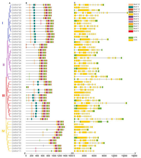 Figure 2. Phylogenetic relationship, motif, and gene structures of RAF gene members in G. hirsutum (A) Evolutionary relationship (B) Structure of conserved motifs (C) Gene architecture.