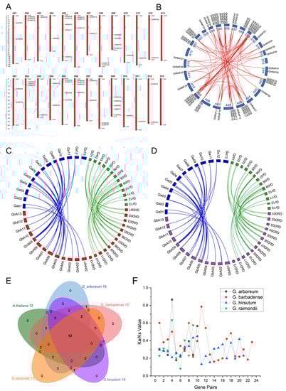 Figure 3. RAF gene distribution on chromosomes, collinearity, synteny and duplication events analysis of RAF genes in cotton (A) Chromosomal map (B) Circos diagram of G. hirsutum (C) Synteny diagram involving G. arboreum, G. raimondii and G. hirsutum (D) Synteny diagram involving G. arboreum, G. raimondii and G. barbadense (E) Venn Diagram among different species clusters (F) Synonymous and nonsynonymous ratio.