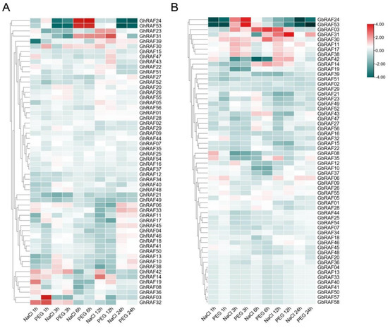 Expression patterns of salt tolerance RAF family members in G. arboreum, G. hirsutum, and G. barbadense were analyzed using published transcriptome databases [13,41,42]. The expression pattern of the RAF gene under polyethylene glycol (PEG) and salt stress was identified at various intervals of time using publicly accessible high throughput RNA seq data to elucidate the potential functional roles of the RAF gene family in cotton. The heatmap of RAF gene expression was designed using TBtools. The expression profile of GhRAF members reveals significant differences (Figure 4A). Across two stress levels at different time intervals, more than half of GhRAF genes were expressed at a low level. Approximately 25% of GhRAF genes exhibited a broad expression range and consistently high expression. Furthermore, several of them had stress-related expressions. Genes GhRAF42, GhRAF52, and GhRAF05, for example, showed high expression at one stress level but low expression in another, suggesting that these three genes may play critical roles in cotton reproductive biology. Moreover, GhRAF24, GhRAF53, GhRAF23, GhRAF31, GhRAF42, GhRAF14, and GhRAF32 were interested in expression analysis. The function of duplicated genes differed in three primary ways due to gene duplication, which is common in tetraploid cotton genomes: pseudogene copies, homologous genes, and new genes with unique roles [13]. The heat map showed that most homologues in the RAF gene family were functionally conserved, while just a few had distinct gene functions. Surprisingly, G. barbadense demonstrated similar behavior concerning expression (Figure 4B). All of the aforementioned findings suggest that the cotton RAF gene family has a lot of functional diversity.