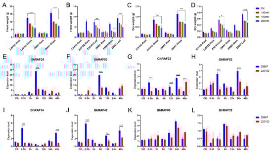Figure 5. Evaluation of different salt stress treatments on root shoot weight for RT-qPCR and expression analysis of candidate genes (A) Fresh weight of root and shoot (B) Fresh weight of root, stem and leaf (C) Dry weight of root and shoot (D) Dry weight of root, stem and leaf. Expression analysis of GhRAF24 (E); GhRAF53 (F); GhRAF23 (G); GhRAF52 (H); GhRAF14 (I); GhRAF42 (J); GhRAF05 (K); GhRAF32 (L). CK means NaCl-untreated as control.0.5–48 h means different time points after NaCl stress. The significant difference is Student ’s t test; * p < 0.05; ** p < 0.01; *** p < 0.001.